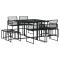 Ensemble à manger de jardin 9 pcs Noir Résine tresséeCet ensemble de salle à manger de jardin est un excellent choix pour les repas en plein air ou pour vous détendre dans le jardin, dans l'arrière-cour ou sur la terrasse. Matériau durable : la résine tressée, également connue sous le nom de poly rotin, est un matériau synthétique solide et nécessitant peu d'entretien qui ressemble au rotin naturel. Il est léger, facile à nettoyer et couramment utilisé pour les meubles d'extérieur en raison de sa durabilité et de ses propriétés de résistance aux intempéries.Rangement compact : ces chaises de jardin peuvent être soigneusement rangés sous la table, ce qui permet d'économiser de l'espace.Dessus en verre : le dessus de la table d'extérieur est fabriqué en verre trempé solide et durable, ce qui le rend facile à nettoyer avec un chiffon humide et ajoute une touche d'élégance à votre espace extérieur.Cadre robuste et stable : le cadre en acier enduit de poudre assure la solidité et la stabilité du meuble de jardin pour une utilisation quotidienne à l'extérieur.Bon à savoir :Pour que vos meubles d'extérieur restent beaux, nous vous recommandons de les protéger avec une housse imperméable. Maximum 110 kg par siège.