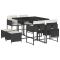 Ensemble à manger de jardin 9pcs coussins noir résine tresséeCet ensemble de salle à manger de jardin est un excellent choix pour les repas en plein air ou pour vous détendre dans le jardin, dans l'arrière-cour ou sur la terrasse. Matériau durable : la résine tressée, également connue sous le nom de poly rotin, est un matériau synthétique solide et nécessitant peu d'entretien qui ressemble au rotin naturel. Il est léger, facile à nettoyer et couramment utilisé pour les meubles d'extérieur en raison de sa durabilité et de ses propriétés de résistance aux intempéries. Rangement compact : ces chaises sont dotées d'un dossier rabattable, ce qui permet de les ranger facilement sous la table. Une fois pliées, elles se rangent parfaitement sous la table, formant un cube peu encombrant. De plus, les tabourets peuvent également être rangés sous les chaises, maximisant encore davantage l'efficacité de l'espace. Expérience d'assise confortable : ce mobilier d'extérieur, doté de coussins épais, offre une expérience d'assise confortable. Housse amovible et lavable : ces coussins de siège sont dotés de housses amovibles pour un lavage et un entretien faciles. Les housses de coussin ont un rabat à l'arrière pour une fixation facile aux dossiers. Dessus en verre : le dessus de la table d'extérieur est fabriqué en verre trempé solide et durable, ce qui le rend facile à nettoyer avec un chiffon humide et ajoute une touche d'élégance à votre espace extérieur. Bon à savoir : Pour que vos meubles d'extérieur restent beaux, nous vous recommandons de les protéger avec une housse imperméable. Maximum 110 kg par siège. Soyez conscient du risque de feu ouvert et d'autres sources de forte chaleur à proximité de l'appareil.