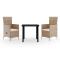 Ensemble à manger de jardin avec coussins 3 pcs BeigeCet élégant ensemble de salle à manger de jardin est destiné à être le point de mire de votre jardin ou patio ! C'est un excellent choix pour les repas en plein air ou pour vous détendre dans l'espace extérieur ! Les cadres en acier enduit de poudre rendent la table et les chaises robustes et stables pour une utilisation quotidienne à l'extérieur. Grâce à la résine tressée résistante à l'eau, les chaises sont faciles à nettoyer et résistantes à l'usure. Le dossier peut être ajusté en tirant sur le bouton sur le côté. Grâce à leur construction légère, elles sont faciles à déplacer. Les coussins de siège bien rembourrés ajoutent également un confort supplémentaire. Les housses en polyester nécessitant peu d'entretien peuvent être retirées et lavées. De plus, le dessus de table en verre lisse est facile à nettoyer avec un chiffon humide et parfait pour ranger des repas, des boissons et d'autres articles décoratifs. Remarque : afin de prolonger la durée de vie des meubles d'extérieur, nous vous recommandons de les protéger avec une housse imperméable. Maximum 110 kg par siège. Soyez conscient du risque de feux ouverts et d'autres sources de forte chaleur à proximité du produit.