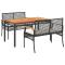 Ensemble à manger de jardin avec coussins 3 pcs NoirCet ensemble de salle à manger de jardin est un excellent choix pour les repas en plein air ou pour vous détendre dans le jardin, dans l'arrière-cour ou sur la terrasse. Matériau durable : la résine tressée, également connue sous le nom de poly rotin, est un matériau synthétique solide et nécessitant peu d'entretien qui ressemble au rotin naturel. Il est léger, facile à nettoyer et couramment utilisé pour les meubles d'extérieur en raison de sa durabilité et de ses propriétés de résistance aux intempéries.Expérience d'assise confortable : ce mobilier d'extérieur, doté de coussins épais, offre une expérience d'assise confortable.Housse amovible et lavable : ces coussins de siège sont dotés de housses amovibles pour un lavage et un entretien faciles.Dessus stable et facile à nettoyer : cette table de jardin a un dessus en bois d'acacia robuste, durable et facile à nettoyer avec un chiffon humide.Cadre robuste et stable : le cadre en acier enduit de poudre assure la solidité et la stabilité du meuble de jardin pour une utilisation quotidienne à l'extérieur. Bon à savoir :Pour que vos meubles d'extérieur restent beaux, nous vous recommandons de les protéger avec une housse imperméable. Maximum 110 kg par siège. Soyez conscient du risque de feu ouvert et d'autres sources de forte chaleur à proximité de l'appareil.