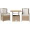 Ensemble à manger de jardin et coussins 3 pcs Beige poly rotinCet ensemble de salle à manger de jardin est un excellent choix pour les repas en plein air ou pour vous détendre dans le jardin, dans l'arrière-cour ou sur la terrasse. Matériau durable : la résine tressée, également connue sous le nom de poly rotin, est un matériau synthétique solide et nécessitant peu d'entretien qui ressemble au rotin naturel. Il est léger, facile à nettoyer et couramment utilisé pour les meubles d'extérieur en raison de sa durabilité et de ses propriétés de résistance aux intempéries.Dossier réglable : ce siège de jardin est doté d'une poignée. Vous pouvez régler le dossier dans n'importe quelle position en tirant sur la poignée et le remettre rapidement dans sa position initiale.Housse amovible et lavable : le coussin de siège est doté d'une housse amovible pour un lavage et un entretien faciles.Dessus de table réglable : le dessus de table peut être soulevé pour rendre la table plus haute, ce qui transforme la table d'extérieur d'une table basse à une table de salle à manger. Elle est parfaite pour recevoir des invités ou prendre des repas à l'extérieur.Dessus stable et facile à nettoyer : cette table de jardin a un dessus en bois d'acacia robuste, durable et facile à nettoyer avec un chiffon humide. Bon à savoir :Pour que vos meubles d'extérieur restent beaux, nous vous recommandons de les protéger avec une housse imperméable. Maximum 110 kg par siège. Soyez conscient du risque de feu ouvert et d'autres sources de forte chaleur à proximité de l'appareil.
