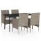Ensemble à manger de jardin coussins 5 pcs Beige/noirCet ensemble de salle à manger de jardin est un excellent choix pour manger ou vous détendre dans l'espace extérieur ! Les cadres en acier enduit de poudre rendent la table et les chaises robustes et stables pour une utilisation quotidienne à l'extérieur. Grâce à la résine tressée résistante à l'eau, les chaises sont faciles à nettoyer et conviennent à un usage quotidien. Le dessus de table en verre lisse est facile à nettoyer avec un chiffon humide et parfait pour placer les repas, les boissons et autres articles décoratifs. Remarque : afin de prolonger la durée de vie des meubles d'extérieur, nous vous recommandons de les protéger avec une housse imperméable. Maximum 110 kg par siège. Soyez conscient du risque de feux ouverts et d'autres sources de forte chaleur à proximité du produit.