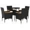Ensemble à manger de jardin et coussins 5 pcs noir rotin verreCet ensemble de salle à manger de jardin est un excellent choix pour les repas en plein air ou pour vous détendre dans le jardin, dans l'arrière-cour ou sur la terrasse. Matériau durable : la résine tressée, également connue sous le nom de poly rotin, est un matériau synthétique solide et nécessitant peu d'entretien qui ressemble au rotin naturel. Il est léger, facile à nettoyer et couramment utilisé pour les meubles d'extérieur en raison de sa durabilité et de ses propriétés de résistance aux intempéries.Expérience d'assise confortable : cet ensemble de meubles d'extérieur, doté de coussins épais, offre une expérience d'assise confortable.Housse amovible et lavable : ces coussins de siège sont dotés de housses amovibles pour un lavage et un entretien faciles.Dessus en verre : le dessus de la table d'extérieur est fabriqué en verre trempé solide et durable, ce qui le rend facile à nettoyer avec un chiffon humide et ajoute une touche d'élégance à votre espace extérieur. Bon à savoir :Pour que vos meubles d'extérieur restent beaux, nous vous recommandons de les protéger avec une housse imperméable. Maximum 110 kg par siège. Soyez conscient du risque de feu ouvert et d'autres sources de forte chaleur à proximité de l'appareil.