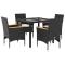 Ensemble à manger de jardin et coussins 5 pcs noir rotin verreCet ensemble de salle à manger de jardin est un excellent choix pour les repas en plein air ou pour vous détendre dans le jardin, dans l'arrière-cour ou sur la terrasse. Matériau durable : la résine tressée, également connue sous le nom de poly rotin, est un matériau synthétique solide et nécessitant peu d'entretien qui ressemble au rotin naturel. Il est léger, facile à nettoyer et couramment utilisé pour les meubles d'extérieur en raison de sa durabilité et de ses propriétés de résistance aux intempéries.Expérience d'assise confortable : cet ensemble de meubles d'extérieur, doté de coussins épais, offre une expérience d'assise confortable.Housse amovible et lavable : ces coussins de siège sont dotés de housses amovibles pour un lavage et un entretien faciles.Dessus en verre : le dessus de la table d'extérieur est fabriqué en verre trempé solide et durable, ce qui le rend facile à nettoyer avec un chiffon humide et ajoute une touche d'élégance à votre espace extérieur. Bon à savoir :Pour que vos meubles d'extérieur restent beaux, nous vous recommandons de les protéger avec une housse imperméable. Maximum 110 kg par siège. Soyez conscient du risque de feu ouvert et d'autres sources de forte chaleur à proximité de l'appareil.