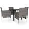 Ensemble à manger de jardin et coussins 5pcs Gris/noirCet ensemble de salle à manger de jardin est un excellent choix pour manger ou vous détendre dans l'espace extérieur ! Les cadres en acier enduit de poudre rendent la table et les chaises robustes et stables pour une utilisation quotidienne à l'extérieur. Grâce à la résine tressée résistante à l'eau, les chaises sont faciles à nettoyer et conviennent à un usage quotidien. Le dessus de table en verre lisse est facile à nettoyer avec un chiffon humide et parfait pour placer les repas, les boissons et autres articles décoratifs. Remarque : afin de prolonger la durée de vie des meubles d'extérieur, nous vous recommandons de les protéger avec une housse imperméable. Maximum 110 kg par siège. Soyez conscient du risque de feux ouverts et d'autres sources de forte chaleur à proximité du produit.