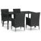 Ensemble à manger de jardin coussins 5pcs Noir Résine tresséeCet ensemble élégant de salle à manger de jardin vous permet de passer des moments agréables et confortables avec votre famille et vos amis. Matériau résistant aux intempéries : la résine tressée, également connue sous le nom de rotin poly, résiste aux intempéries et est facile à nettoyer. Elle reste belle à l'extérieur pendant une longue période. Elle offre une excellente qualité, commodité et un aspect esthétique. Cadre robuste et stable : le cadre en acier enduit de poudre de l'ensemble à manger assure robustesse et stabilité. Expérience d'assise confortable : les coussins bien rembourrés des chaises à manger offrent un confort ultime pour votre temps d'assise.Table pratique : le dessus lisse de la table de salle à manger est en verre trempé, facile à nettoyer avec un chiffon humide. De plus, le dessus robuste est parfait pour placer des repas, des boissons et d'autres objets décoratifs.Conception flexible : grâce à la construction légère, ces chaises à dîner de jardin sont faciles à déplacer. Remarque :Pour que vos meubles d'extérieur restent beaux, nous vous recommandons de les protéger avec une housse imperméable. Maximum 110 kg par siège. Soyez conscient du risque de feu ouvert et d'autres sources de forte chaleur à proximité de l'appareil.