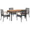 Ensemble à manger de jardin coussins 5pcs Noir Résine tresséeCet ensemble de salle à manger de jardin est un excellent choix pour les repas en plein air ou pour vous détendre dans le jardin, dans l'arrière-cour ou sur la terrasse. Matériau durable : la résine tressée, également connue sous le nom de poly rotin, est un matériau synthétique solide et nécessitant peu d'entretien qui ressemble au rotin naturel. Il est léger, facile à nettoyer et couramment utilisé pour les meubles d'extérieur en raison de sa durabilité et de ses propriétés de résistance aux intempéries.Expérience d'assise confortable : ce mobilier d'extérieur, doté de coussins épais, offre une expérience d'assise confortable.Housse amovible et lavable : ces coussins de siège sont dotés de housses amovibles pour un lavage et un entretien faciles.Dessus stable et facile à nettoyer : cette table de jardin a un dessus en bois d'acacia robuste, durable et facile à nettoyer avec un chiffon humide.Cadre robuste et stable : le cadre en acier enduit de poudre assure la solidité et la stabilité du meuble de jardin pour une utilisation quotidienne à l'extérieur. Bon à savoir :Pour que vos meubles d'extérieur restent beaux, nous vous recommandons de les protéger avec une housse imperméable. Maximum 110 kg par siège.