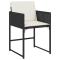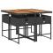 Ensemble à manger de jardin coussins 5pcs Noir Résine tresséeCet ensemble de salle à manger de jardin est un excellent choix pour les repas en plein air ou pour vous détendre dans le jardin, dans l'arrière-cour ou sur la terrasse. Matériau durable : la résine tressée, également connue sous le nom de poly rotin, est un matériau synthétique solide et nécessitant peu d'entretien qui ressemble au rotin naturel. Il est léger, facile à nettoyer et couramment utilisé pour les meubles d'extérieur en raison de sa durabilité et de ses propriétés de résistance aux intempéries.Rangement compact : ces chaises sont dotées d'un dossier rabattable, ce qui permet de les ranger facilement sous la table. Une fois pliées, elles se rangent parfaitement sous la table, formant un cube peu encombrant.Expérience d'assise confortable : ce mobilier d'extérieur, doté de coussins épais, offre une expérience d'assise confortable.Housse amovible et lavable : ces coussins de siège sont dotés de housses amovibles pour un lavage et un entretien faciles. Les housses de coussin ont un rabat à l'arrière pour une fixation facile aux dossiers.Dessus stable et facile à nettoyer : cette table de jardin a un dessus en bois d'acacia robuste, durable et facile à nettoyer avec un chiffon humide. Bon à savoir :Pour que vos meubles d'extérieur restent beaux, nous vous recommandons de les protéger avec une housse imperméable. Maximum 110 kg par siège. Soyez conscient du risque de feu ouvert et d'autres sources de forte chaleur à proximité de l'appareil.