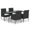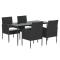 Ensemble à manger de jardin coussins 5pcs Noir Résine tresséeProfitez d'un bon repas ou d'un thé l'après-midi dans votre espace extérieur avec cet ensemble de salle à manger de jardin ! Matériau résistant aux intempéries : la résine tressée, également connue sous le nom de rotin poly, résiste aux intempéries et est facile à nettoyer. Elle reste belle à l'extérieur pendant une longue période. Elle offre une excellente qualité, commodité et un aspect esthétique. Cadre robuste : les cadres en acier enduit de poudre rendent l'ensemble de salle à manger d'extérieur robuste et stable pour une utilisation quotidienne à l'extérieur. Dessus de table pratique : le dessus lisse de la table de salle à manger est en verre trempé, facile à nettoyer avec un chiffon humide. De plus, le dessus robuste est parfait pour placer des repas, des boissons et d'autres objets décoratifs. Design confortable : conçues avec des dossiers et des accoudoirs incurvés, ces chaises d'extérieur offrent un maximum de confort. Confort supplémentaire : les coussins bien rembourrés offrent un confort ultime pendant votre temps d'assise. Remarque : Afin de prolonger la durée de vie de votre mobilier d'extérieur, nous vous recommandons de le protéger avec une housse imperméable. Chaque produit est livré avec un manuel de montage dans la boîte pour un montage facile. Maximum 110 kg par siège. Soyez conscient du risque de feu ouvert et d'autres sources de forte chaleur à proximité de l'appareil.
