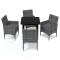 Ensemble à manger de jardin coussins 5pcs Résine tressée GrisCet ensemble de salle à manger de jardin est une combinaison parfaite de style et de fonctionnalité et est destiné à être le point de mire de votre jardin, balcon ou patio. Avec un cadre en acier robuste enveloppé de résine tressée résistante aux intempéries, les chaises de jardin sont à l'épreuve de la rouille et de la moisissure, offrant des années de détente de qualité. La table d'extérieur présente un dessus de table en verre aux lignes simples, facile à nettoyer et adapté à une utilisation en extérieur. Le cadre en aluminium assure également la stabilité et la robustesse. De plus, les coussins bien rembourrés offrent un confort ultime pendant votre temps assis. Cet ensemble de salle à manger de patio est facile à déplacer grâce à sa construction légère. Remarque : afin de prolonger la durée de vie des meubles d'extérieur, nous vous recommandons de les protéger avec une housse imperméable. Maximum 110 kg par siège. Soyez conscient du risque de feu ouvert et d'autres sources de forte chaleur à proximité de l'appareil.