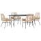 Ensemble à manger jardin coussins 5pcs marron poly rotin verreCet ensemble de salle à manger de jardin est un excellent choix pour les repas en plein air ou pour vous détendre dans le jardin, dans l'arrière-cour ou sur la terrasse. Matériau durable : la résine tressée, également connue sous le nom de poly rotin, est un matériau synthétique solide et nécessitant peu d'entretien qui ressemble au rotin naturel. Elle est légère, facile à nettoyer et couramment utilisée pour les meubles d'extérieur en raison de sa durabilité et de ses propriétés de résistance aux intempéries. Cadre robuste et stable : le cadre en acier enduit de poudre est solide, stable, durable et résistant à la corrosion et aux intempéries, ce qui garantit des performances durables. Dossier et accoudoir pratiques : cette chaise de jardin est dotée d'un dossier et de deux accoudoirs qui offrent un soutien et un confort optimaux aux utilisateurs. Housse amovible et lavable : ces coussins de siège sont dotés de housses amovibles pour un lavage et un entretien faciles. Dessus en verre : le dessus de la table d'extérieur est fabriqué en verre trempé solide et durable, ce qui le rend facile à nettoyer avec un chiffon humide et ajoute une touche d'élégance à votre espace extérieur. Bon à savoir : Pour que vos meubles d'extérieur restent beaux, nous vous recommandons de les protéger avec une housse imperméable. Maximum 110 kg par siège. Soyez conscient du risque de feux ouverts et d'autres sources de forte chaleur à proximité du produit.