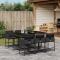 Ensemble à manger de jardin coussins 7pcs Noir Résine tresséeCet ensemble de salle à manger de jardin est un excellent choix pour les repas en plein air ou pour vous détendre dans le jardin, dans l'arrière-cour ou sur la terrasse. Matériau durable : la résine tressée, également connue sous le nom de poly rotin, est un matériau synthétique solide et nécessitant peu d'entretien qui ressemble au rotin naturel. Il est léger, facile à nettoyer et couramment utilisé pour les meubles d'extérieur en raison de sa durabilité et de ses propriétés de résistance aux intempéries. Rangement compact : ces chaises sont dotées d'un dossier rabattable, ce qui permet de les ranger facilement sous la table. Une fois pliées, elles se rangent parfaitement sous la table, formant un cube peu encombrant. Expérience d'assise confortable : ce mobilier d'extérieur, doté de coussins épais, offre une expérience d'assise confortable. Housse amovible et lavable : ces coussins de siège sont dotés de housses amovibles pour un lavage et un entretien faciles. Les housses de coussin ont un rabat à l'arrière pour une fixation facile aux dossiers. Dessus en verre : le dessus de la table d'extérieur est fabriqué en verre trempé solide et durable, ce qui le rend facile à nettoyer avec un chiffon humide et ajoute une touche d'élégance à votre espace extérieur. Bon à savoir : Pour que vos meubles d'extérieur restent beaux, nous vous recommandons de les protéger avec une housse imperméable.
