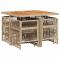 Ensemble à manger de jardin et coussins 9 pcs beige Poly rotinCet ensemble de salle à manger de jardin est un excellent choix pour les repas en plein air ou pour vous détendre dans le jardin, dans l'arrière-cour ou sur la terrasse. Matériau durable : la résine tressée, également connue sous le nom de poly rotin, est un matériau synthétique solide et nécessitant peu d'entretien qui ressemble au rotin naturel. Il est léger, facile à nettoyer et couramment utilisé pour les meubles d'extérieur en raison de sa durabilité et de ses propriétés de résistance aux intempéries. Rangement compact : ces chaises sont dotées d'un dossier rabattable, ce qui permet de les ranger facilement sous la table. Une fois pliées, elles se rangent parfaitement sous la table, formant un cube peu encombrant. De plus, les tabourets peuvent également être rangés sous les chaises, maximisant encore davantage l'efficacité de l'espace. Expérience d'assise confortable : ce mobilier d'extérieur, doté de coussins épais, offre une expérience d'assise confortable. Housse amovible et lavable : ces coussins sont dotés de housses amovibles pour un lavage et un entretien faciles. Les housses de coussin ont un rabat à l'arrière pour une fixation facile aux dossiers. Dessus stable et facile à nettoyer : cette table de jardin a un dessus en bois d'acacia robuste, durable et facile à nettoyer avec un chiffon humide. Bon à savoir : Pour que vos meubles d'extérieur restent beaux, nous vous recommandons de les protéger avec une housse imperméable.