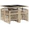 Ensemble à manger de jardin et coussins 9 pcs beige Poly rotinCet ensemble de salle à manger de jardin est un excellent choix pour les repas en plein air ou pour vous détendre dans le jardin, l'arrière-cour ou le patio. Matériau durable : la résine tressée, également connue sous le nom de poly rotin, est un matériau synthétique solide et nécessitant peu d'entretien qui ressemble au rotin naturel. Elle est légère, facile à nettoyer et couramment utilisée pour les meubles d'extérieur en raison de sa durabilité et de ses propriétés de résistance aux intempéries. Dessus en verre : le dessus de la table d'extérieur est fabriqué en verre trempé solide et durable, ce qui le rend facile à nettoyer avec un chiffon humide et ajoute une touche d'élégance à votre espace extérieur. Rangement compact : ces chaises sont dotées d'un dossier rabattable, ce qui permet de les ranger facilement sous la table. Une fois pliées, elles se rangent parfaitement sous la table, formant un cube peu encombrant. De plus, les tabourets peuvent également être rangés sous les chaises, maximisant encore davantage l'efficacité de l'espace. Expérience d'assise confortable : ce mobilier d'extérieur, doté de coussins épais, offre une expérience d'assise confortable. Housse amovible et lavable : ces coussins de siège sont dotés de housses amovibles pour un lavage et un entretien faciles. Les housses de coussin de chaise ont un rabat à l'arrière pour une fixation facile aux chaises. Bon à savoir : Pour que vos meubles d'extérieur restent beaux, nous vous recommandons de les protéger avec une housse imperméable.