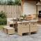 Ensemble à manger de jardin et coussins 9 pcs beige Poly rotinCet ensemble de salle à manger de jardin est un excellent choix pour les repas en plein air ou pour vous détendre dans le jardin, dans l'arrière-cour ou sur la terrasse. Matériau durable : la résine tressée, également connue sous le nom de poly rotin, est un matériau synthétique solide et nécessitant peu d'entretien qui ressemble au rotin naturel. Il est léger, facile à nettoyer et couramment utilisé pour les meubles d'extérieur en raison de sa durabilité et de ses propriétés de résistance aux intempéries. Rangement compact : ces chaises sont dotées d'un dossier rabattable, ce qui permet de les ranger facilement sous la table. Une fois pliées, elles se rangent parfaitement sous la table, formant un cube peu encombrant. De plus, les tabourets peuvent également être rangés sous les chaises, maximisant encore davantage l'efficacité de l'espace. Expérience d'assise confortable : ce mobilier d'extérieur, doté de coussins épais, offre une expérience d'assise confortable. Housse amovible et lavable : ces coussins de siège sont dotés de housses amovibles pour un lavage et un entretien faciles. Dessus en verre : le dessus de la table d'extérieur est fabriqué en verre trempé solide et durable, ce qui le rend facile à nettoyer avec un chiffon humide et ajoute une touche d'élégance à votre espace extérieur. Bon à savoir : Pour que vos meubles d'extérieur restent beaux, nous vous recommandons de les protéger avec une housse imperméable. Maximum 110 kg par siège. Soyez conscient du risque de feu ouvert et d'autres sources de forte chaleur à proximité de l'appareil.