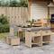 Ensemble à manger de jardin et coussins 9 pcs mélange beigeCet ensemble de salle à manger de jardin est un excellent choix pour les repas en plein air ou pour vous détendre dans le jardin, dans l'arrière-cour ou sur la terrasse. Matériau durable : la résine tressée, également connue sous le nom de poly rotin, est un matériau synthétique solide et nécessitant peu d'entretien qui ressemble au rotin naturel. Il est léger, facile à nettoyer et couramment utilisé pour les meubles d'extérieur en raison de sa durabilité et de ses propriétés de résistance aux intempéries.Rangement compact : ces chaises sont dotées d'un dossier rabattable, ce qui permet de les ranger facilement sous la table. Une fois pliées, elles se rangent parfaitement sous la table, formant un cube peu encombrant. De plus, les tabourets peuvent également être rangés sous les chaises, maximisant encore davantage l'efficacité de l'espace.Expérience d'assise confortable : ce mobilier d'extérieur, doté de coussins bien rembourrés, offre une expérience d'assise confortable.Housse amovible et lavable : ces coussins de siège sont dotés de housses amovibles pour un lavage et un entretien faciles. Les housses de coussin de chaise ont un rabat à l'arrière pour une fixation facile aux chaises.Dessus stable et facile à nettoyer : cette table de jardin est dotée d'un dessus en verre trempé robuste, durable et facile à nettoyer à l'aide d'un chiffon humide. Bon à savoir : Pour que vos meubles d'extérieur restent beaux, nous vous recommandons de les protéger avec une housse imperméable. Maximum 110 kg par siège.