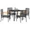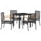 Ensemble de salle à manger de jardin , 5 pièces, avec coussins en poly raton noirCet ensemble de quatre chaises de jardin allie confort et style, idéal pour les repas dehors ou les moments de détente sur ton patio. Fabriquées avec des matériaux solides comme le rattan PE et des coussins épais, elles apportent relaxation et élégance à ton espace extérieur. Matériau Durable : Fabriqué avec du rattan PE, facile à entretenir et léger, c'est un super choix pour l'extérieur. Assise Confortable : Chaque chaise a de épais coussins qui rendent vraiment parties de détente bien plus agréables. Coussins Amovibles : Tu peux enlever les housses des coussins pour les laver, ce qui rend le nettoyage des sièges de jardin beaucoup plus simple. Cadre Stable : Avec un cadre robuste en acier revêtu, ces chaises sont solides et peuvent affronter les intempéries, promettant leur longévité dehors. Design Élégant : Les couleurs noire et brune avec des touches de bois naturel apportent un style moderne à tout espace extérieur, rendant ton patio ou jardin super beau. Maximum 110 kg par siège.