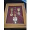 Ensemble de décorations du Mérite Agricole, occasion: commandeur, officier, chevalier et sa réduction. Le commandeur possède trois poinçons, manque d'émail recto-verso et le ruban. Ensemble cohérent dans un cadre.