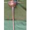 Epée Espagnole de TAZA du XVII siécle ( 1 ére moitiée) .Poignée en bois, ( substituée) monture Taza ( la taza a perdu plus de 40% , et a des soudoures visibles) , acier ainsi comme le pommeau avec deux vis ( Substituées) lâme trés oxydée mais netyoée, de grand dimension.Celui lá pas de marquages. De origine clarement Espagnole, gardes trés longues.