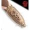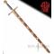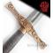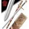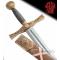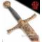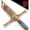 Superbe reproduction de l'epee legendaire "Excalibur" de la marque DENIX. Lame en acier vieilli avec gorge au milieu. Monture metal finition or vieilli, pommeau avec gravure "Excalibur" et garde avec gravure de 2 dragons. Livre avec son fourreau brun richement decore avec lanière, ornement avec gravure dragon, sceau et gravure "Excalibur" Longueur total : 112cm Longueur de la lame : 75 cm Finition parfaite.