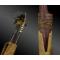 Fourreau en bois avec un décors géométrique en plaque d’os et bois sombre, ceinturé par des fils en fibres végétales et peau ; il est fixé un étui accueillant un stylet à simple tranchant au manche en bois et corne. Bandoulière en fibres tressées avec un pompon en perles.