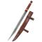Les poignées en bois, fixées par des rivets et maintenues par deux anneaux en laiton, assurent une prise solide tout en respectant les techniques artisanales du haut Moyen Âge. L'ensemble est complété par un fourreau en cuir de boeuf robuste, conçu pour protéger la lame et offrir une présentation élégante. Bien que non affûtée, cette réplique se prête parfaitement à la reconstitution historique, à l'exposition ou à l'étude des armes anglo-saxonnes.
