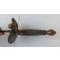 La lame, droite et à double pan, est en état moyen, noircie et oxydée. Elle est légèrement tordue.