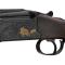 Une carabine Express raffinée avec sa bascule noire avec sanglier doré en action de chasse.