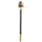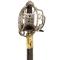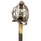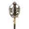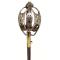 Monture en fer forgé, garde ornée de cinq panneau de fer plat, percés à jour de motifs décoratifs dont deux fleurs de lys, reliés entre eux et au reste de la montures par de nombreuses branches. LA garde est une véritable cage dans laquelle la main est abritée. Une doublure en cuir garni l'intérieur à la base de la poignée en bois recouvert de cuir filigrané de fils de fer torsadé, fort pommeau très caractéristique des armes écossaise en forme de cône évasé dont la base large recouvre l'anneau de fixation de la garde, gravure "CCC29" sur la face arrière, une autre inscription "H.R." sur le petit panneau face avant de la monture.
