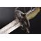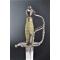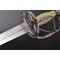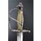 Monture multi-branches en fer noirci à deux branches principales avec sur l'arc de jointure un nom ou une inscription poinçonné et deux branches secondaires dont une retient le poucier, quillon recourbé en forme de bouton. Double pontat repercé. Fusée de bois filigranée de laiton à deux viroles. Pommeau ovoïde à deux vis maintenant les branches principales. Lame droite de 89 cm, large de 3,4 cm au talon, double tranchant et gouttière médiane gravé au loup de passau de Solingen. Sans fourreau. Trace de combat sur le tranchant, tache d'oxydation sur un côté du talon.