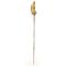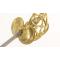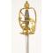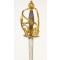 Monture forte à la mousquetaire en laiton doré, à deux branches principales et deux branches secondaires amovibles formant palmette et deux C opposés. Pommeau de forme ovale. Clavier bivalve. Fusée en bois entièrement filigrané d'argent. Viroles tressées en fils d'argent. Lame de 90 cm à l'origine, et sur cet exemplaire elle fait 87 cm, largeur au talon 2,9 cm, double tranchant à méplat central, gravure en parti effacée d'arabesques, inscription "Justicia " surmontant Thémis déesse de la justice. Sans fourreau.