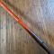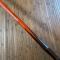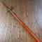 Hampe en bois de bambou rouge et noir , fer trident sur douille fermé en laiton à trois bourrelets , fer hors douille 42 cm avec douille 55 cm , fourche trois piques un fort pique central quadrangulaire de 40 cm entouré de deux piques plat courbé..