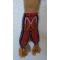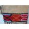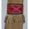 Cousu sur une peau épaisse ( Wapiti ? )  tannée à la fumée , orné de tissu laine rouge et bleu marine et de motifs linéaires perlés.