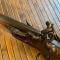 Double platines à silex signées à droite « DUCHET » manque une vis chien bloqué ET platine gauche marqué "A. THIERS" fonctionnel un manque à la batterie , chiens col de cygne à pied de renfort à corps ronds. . Toutes garnitures en fer uni, découpées.