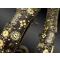 Monture en bois entie?rement incruste?e de plaques d’os a? motifs de fleurs, orne?e de clous et de ba- gues en laiton cisele?. Renfort en fer de?coupe?.