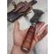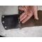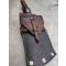 Etui fourreau en cuir marron à accrocher à la ceinture, rivets aluminium et laiton, des douilles de calibre 22lr font office de rivet et pour finir, couture au fil de chanvre.