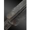Lame droite en acier à double tranchant, arrête médiane et gorges symétriques, gravée d’arabesques et frises. Pointe en perce maille.
