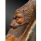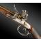Monture en noyer à fût court mouluré et sculpté. Crosse à joue sculptée d’une tête de lion sur fond finement quadrillé. Trace d’une fine enture dans le découpage du bois. Garnitures en fer, ciselées et gravées. Coussin d’origine en cuir cerné d’une baguette en argent riveté.