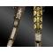 Canon a? pans puis rond maintenu a? la mon- ture par dix-sept capucines en argent es- tampe?. Platine a? silex, a? chenapan en acier orne? d’une plaque en argent estampe?. Ba- guette en fer. Monture en bois recouverte de plaques en os a? de?cor de frises de motifs ge?ome?triques et clous d'argent, rehausse?e d’une demie bague en argent estampe? et d’une demie croix en argent. La crosse en corne et bois est renforce?e d’un pourtour en fer de?coupe?. Le pontet est en laiton rehausse? d’argent cisele?.