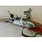 Les platines à silex, de belle facture, montrent une forte bombure sur la plaque, le chien et la batterie. L’arrière de la batterie est orné d’un becquet décoratif. Les plaques de platines ont été ressemelées, permettant ainsi une bonne production d’étincelles. Les bassinets ronds sont équipés de gardes-feu.