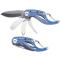 Longueur fermé 5.71cm. Blue anodized aluminum handles. Locking stainless components. Features standard edge knife blade, file with Phillips head screwdriver tip, medium flathead screwdriver, small flathead screwdriver, bottle opener and attachment clip. Hang packaged.