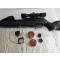Vendue avec sa lunette de visée, deux chargeurs de dix plombs, et deux boites de plombs quelques cibles carton et guide de l'utilisateur..