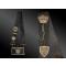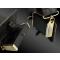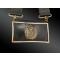 Patelette de forme trapézoïdale, encadrée d’un jonc argenté et décorée en son centre des armes de France flanquées de faisceaux de drapeaux.