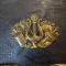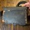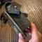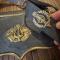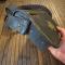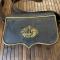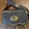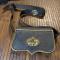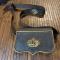 Entièrement en cuir noir, coffret bois habillé de cuir, a crochets de suspension latérale , pattelette en cuir bordée d'un jonc en laiton doré avec en son centre un emblème en laiton doré estampé d'une lyre et d'un trophée d'instruments de musique. Complet avec banderole en cuir verni noir à bouclerie de laiton et symbole des musiciens en laiton en relief . bon état de conservation, quelques usure au cuir au dos .