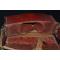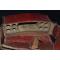 Coffret avec auge en bois compartimenté pour les cartouches et accessoires, recouvert de maroquin rouge. Les flans sont galonnés d'un tissage d'argent.