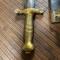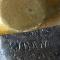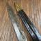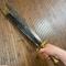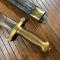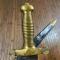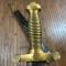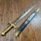 Belle poignée en bronze poinçonné R ou B Étoilée, lame à double tranchant avec traces du temps marqué du fournisseur JEAN et son fourreau en cuir décousu à deux garnitures laiton et pâte en cuir de buffle blanc.