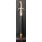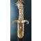 Monture en laiton fondu ciselé et anciennement doré en forme de cou et tête de coq. Croisière plate symétrique, soulignée d'un filet gravé. Lame droite, à dos et pans-creux, de 67,50 cm sur 4,4 cm de talon, épaisseur 0,9 cm, contre-tranchant.