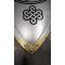 Le bouclier est orné de la Croix Pattée et du sceau des 2 Cavaliers avec la devise Templière.