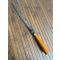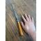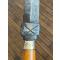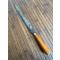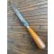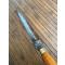 Manche conique octogonal à 8 pans en bois châtaignier, garniture laiton, mitre décoré. Reste de gravure, quadrillage sur la lame. Ricasso comportant une croix et un quadrillage sur son ensemble. Lame forgée 26 cm longueur total 38,5 cm.