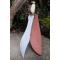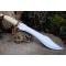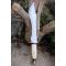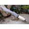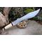 Couteau chasseur d'ours à lame fixe - Longueur totale 44cm - Longueur de lame 30.5cm - Dents sur le haut de la lame - Lame en acier Carbone 1055 - Lame clip point recurve - Garde & Pommeau en laiton - Pommeau guilloché - Manche en os - Entretoises - Fabrication Artisanale - Etui cuir